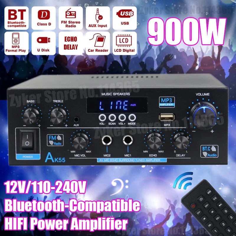 AK35/AK45/AK55 Sound Amplifiers Bluetooth Digital Amplifier for Home Car Karaoke 2 Channel HiFi Stereo AMP FM USB Remote Control
