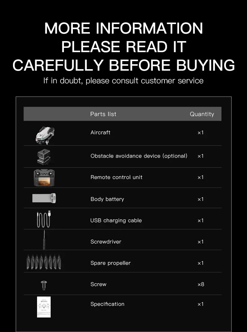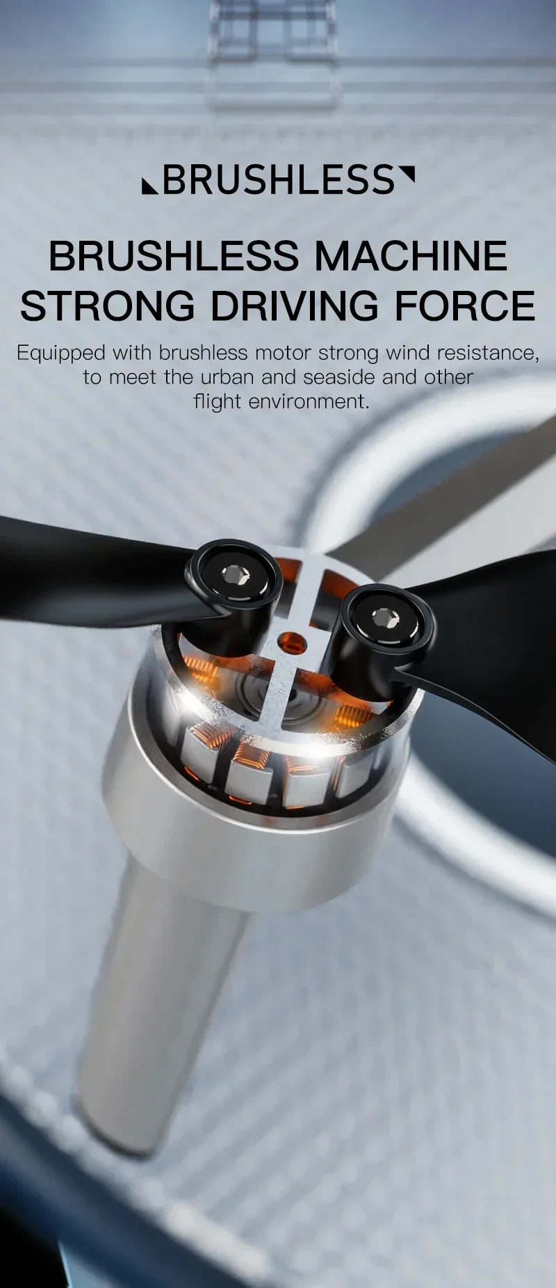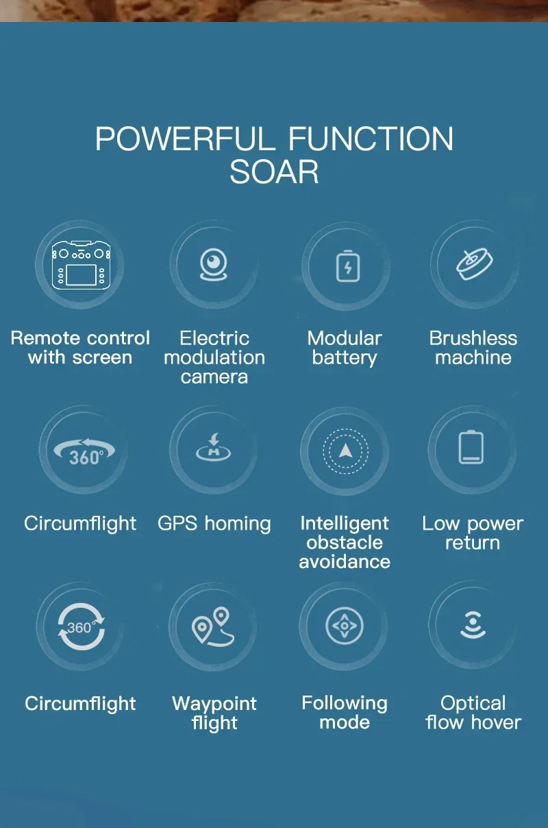 Brushless motor, electrically adjustable camera, up and down, left and right rotation, forward, backward, left and right side flight, fast and slow speed control, headless mode, optical flow fixed altitude and fixed point, dual camera switching, the drone comes with GPS positioning function, which can achieve powerful functions such as one click return, low power and loss of control automatic return, dual cameras with optical flow fixed altitude mode and four-way obstacle avoidance function