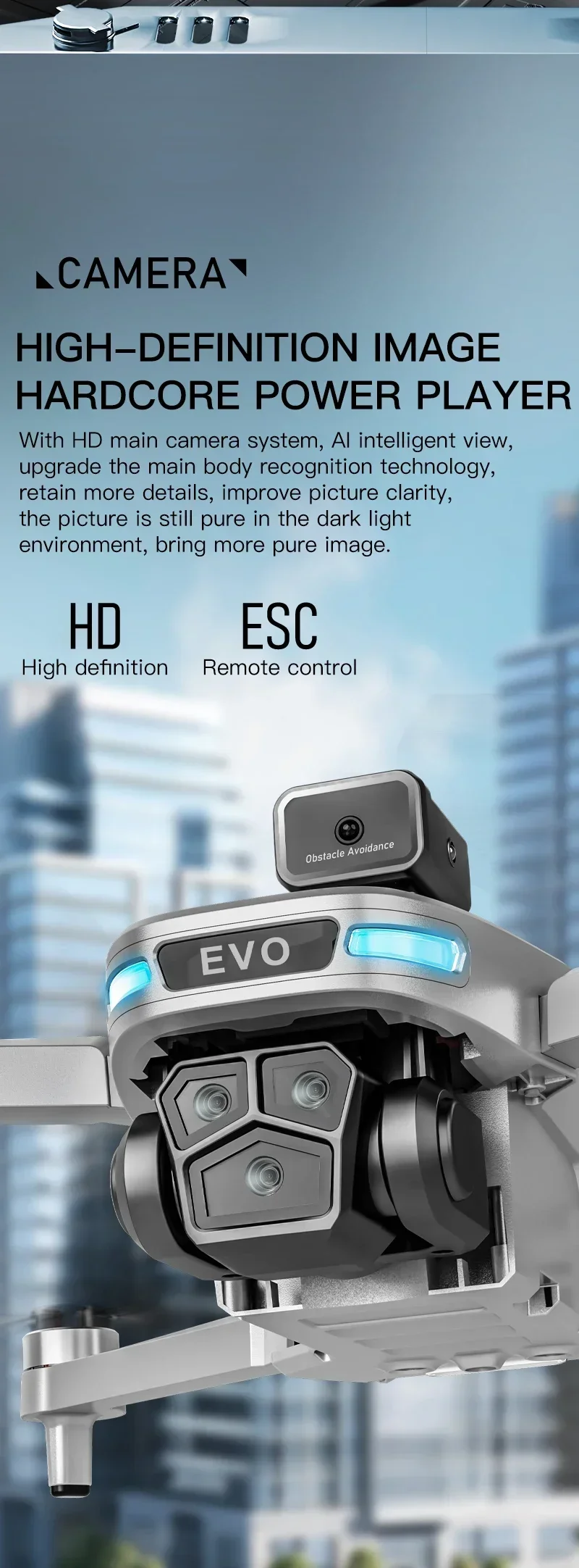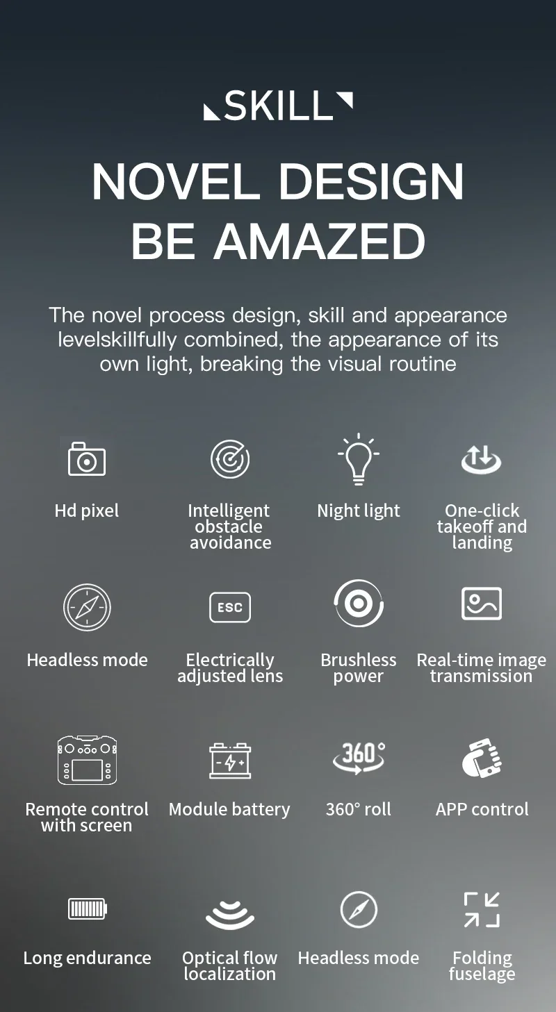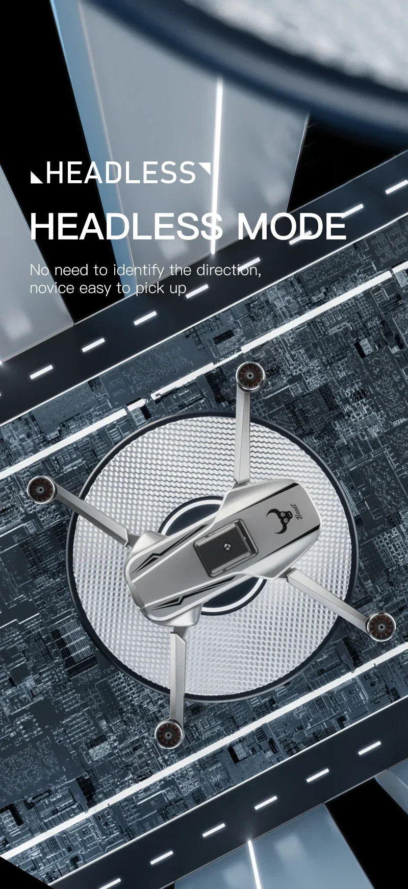 Brushless motor, electrically adjustable camera, up and down, left and right rotation, forward, backward, left and right side flight, fast and slow speed control, headless mode, optical flow fixed height and point, gesture photography, gesture recording, one click backward. Dual camera switching